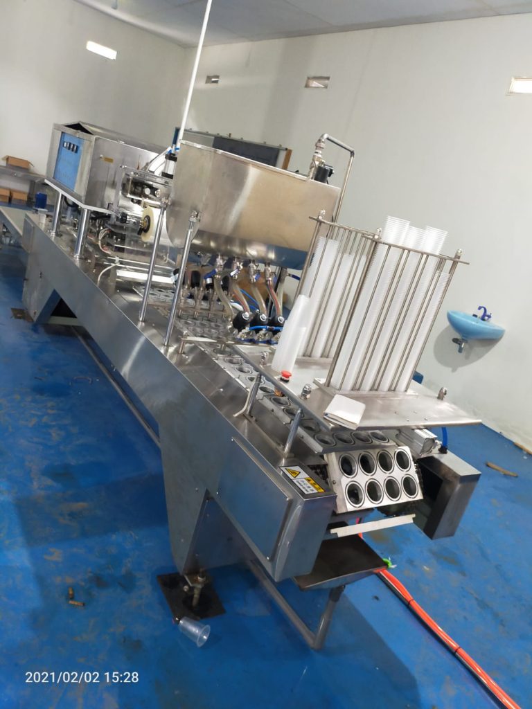 Mesin yang dirancang untuk mengisi, menutup, dan menyegel produk air minum dalam kemasan berbentuk cup secara otomatis. Mesin ini memiliki konfigurasi 4×2 line, yang berarti terdapat empat baris dengan dua kolom pengisian, sehingga memungkinkan pengisian delapan cup secara bersamaan. Mesin ini biasanya digunakan di industri pengemasan air minum, karena meningkatkan efisiensi produksi dan konsistensi pengisian.